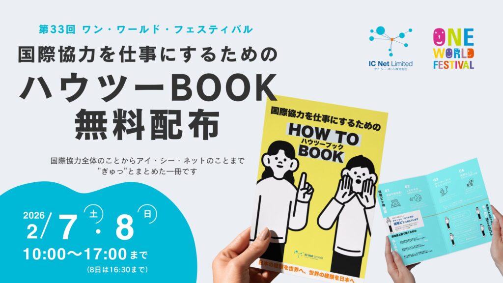 今回、アイ・シー・ネットのブースでは、企業が取り組む国際協力の「仕事」についてご紹介するほか、来場者限定で「国際協力を仕事にするためのハウツーBOOK」を無料配布いたします。企業として取り組む国際協力の在り方や、当社の仕事内容にご関心をお持ちの方は、ぜひこの機会にお立ち寄りください。