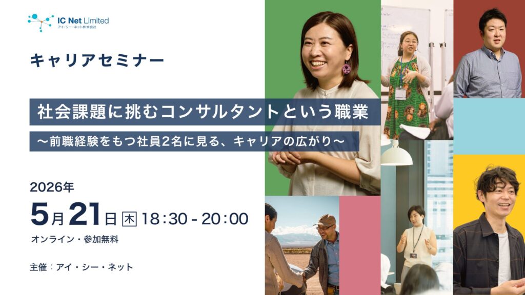 アイ・シー・ネットは、コンサルティング事業を通じて世界の社会課題解決に取り組んでいます。今回、コンサルタントという職業をより身近に知っていただくため、キャリアセミナーを開催します。